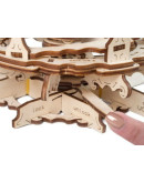 Модель Ugears Ветряная мельница используется полноценный цепной привод, изготовленный из фанеры и дополненный канцелярской резинкой. Такой привод ранее никогда не использовался в пазлах Ugears. Чтобы завести механизм, необходимо повернуть нижнюю часть башни на несколько оборотов. Расположенный сбоку рычаг фиксирует механизм в заведенном состоянии. Как только вы переведете рычаг в обратное положение, лопасти и нижняя часть башни начинают свое вращение, при этом лопасти будут создавать ветер. Механизм может работать и наоборот: поставьте рядом с моделью вентилятор, и лопасти мельницы будут вращаться от создаваемых им потоков воздуха.