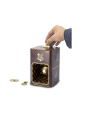 Копилка выполнена в бордовом цвете с желтыми деталями. На корпусе аксессуара располагаются детали в виде герба Хогвартса, графической миниатюры снитча и других деталей из фантастического мира.