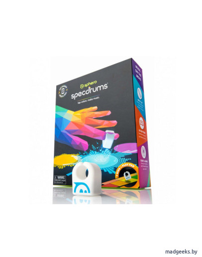 Sphero Specdrums выполнен в форм-факторе кольца, поэтому его удобно использовать, надев на палец. Корпус из пластика белого цвета дополнен синим рисунком. На внешней стороне расположен датчик, считывающий цвета.