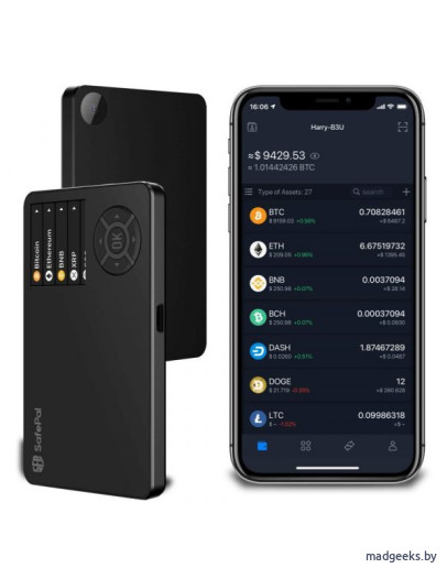 Аппаратный кошелек SafePal S1 поддерживает технологию совершения транзакций через камеру и дисплей (AirGaped). Устройство невозможно подключить через Wifi, Bluetooth или кабель к ПК и иным устройствам, что обеспечивает полностью офлайн хранение приватных ключей. SafePal S1 совмещает стандартный микроконтроллер для обычных операций и безопасный чип EAL 5+ для хранения приватных ключей + встроенный генератор случайных чисел AIS31. К тому же в устройстве встроен механизм «самоуничтожения» приватный ключей на случай внешнего воздействия — вскрытия корпуса устройства. Имеется защита PIN-кодом и поддержка предложений по улучшению биткоина BIP39, BIP44.