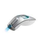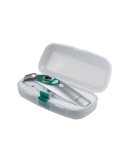 Корпус термометра выполнен в приятном серебристом и белом цвете. На верхней части корпуса гаджета располагается табло, окантованное зеленым цветом. Две кнопки управления отвечают за включение, выключение устройства и измерение показателя.