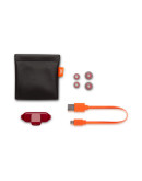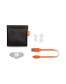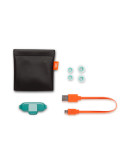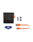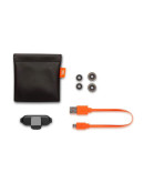 JBL E25BT по праву считается одной из самых легких гарнитур. Её вес составляет всего 16,5 грамм. К источнику звука аксессуар подключается по Bluetooth, не требуя проводов. Путешествуйте, занимайтесь спортом, работайте или просто занимайтесь домашними делами под музыку: автономная и компактная гарнитура дарит полную свободу движений. Единственный кабель соединяет наушники между собой и имеет приятную на ощупь тканевую оплетку, которая не позволяет ему запутываться. На кабеле расположена клипса для крепления гарнитуры к одежде. Удобный трехкнопочный пульт управления с микрофоном и слотом micro-USB для зарядки также находится на кабеле наушников.