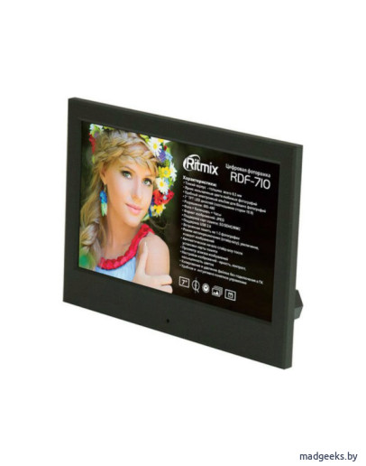 Ritmix RDF-710 – цифровая рамка для просмотра фотографий. Устройство позволяет регулировать яркость и контраст изображения, воспроизводит слайд-шоу со съёмных носителей. Украсьте комнату или рабочий стол снимками родных и друзей в высоком разрешении. Переключайте фото по желанию, установите автоматическую смену кадров. Используйте функции органайзера, чтобы активировать таймер или вывести на экран часы с календарём.