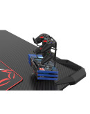 На столе расположена стойка для дисков, слева ― двойной подвес для гарнитуры. Справа предусмотрена подставка для чашки кофе. Подставка расположена ниже рабочей зоны, что минимизирует риск случайного опрокидывания кружки. Размер рабочей поверхности ― 113 х 61,5 см.