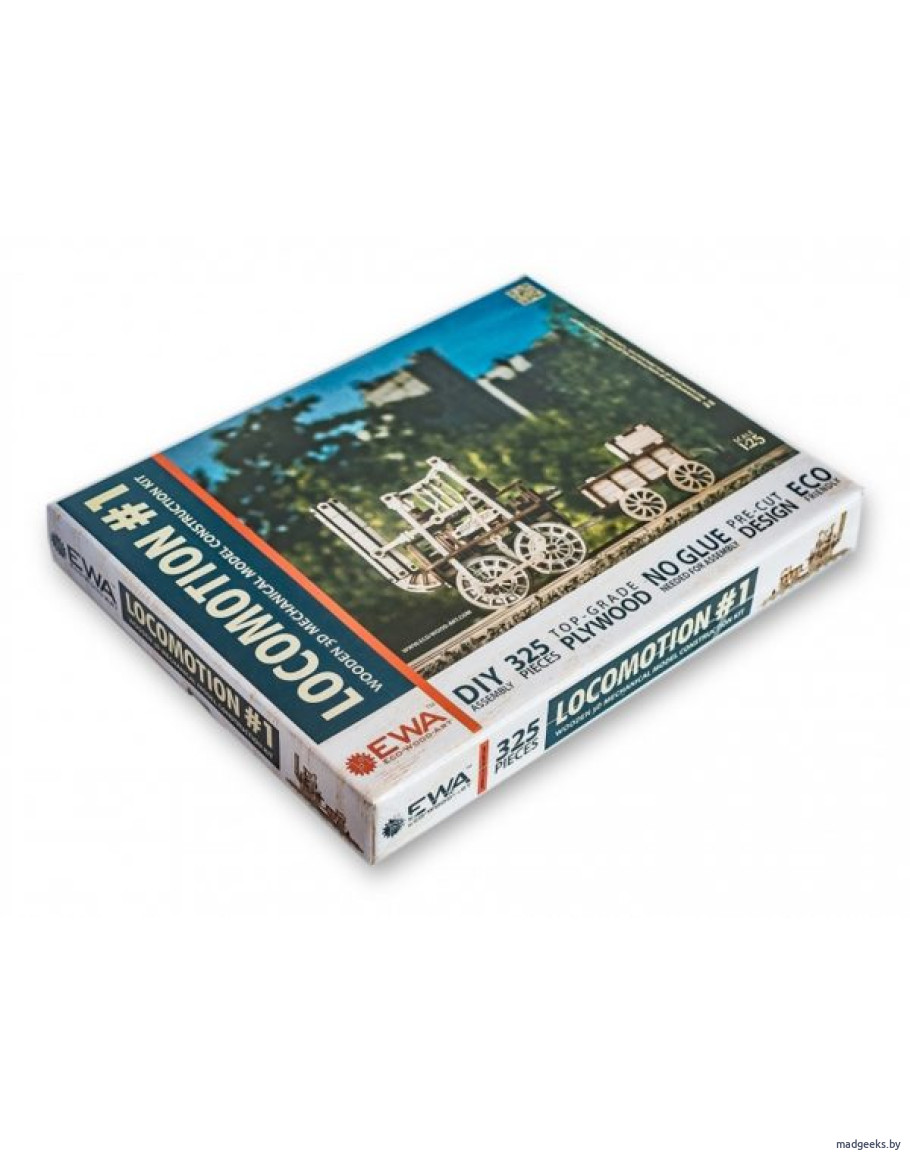Локомотив #1 — механическая модель локомотива выпуска 1825 года, который первым перевез людей по первой в мире общественной железной дороге Стоктон-Дарлингтон в Великобритании. Историческая действующая модель с резиномотором для самостоятельной сборки. Дает общее представление о механике передачи движения от двигателя на колеса. Идеальная настольная модель паровоза в сцепке с тендером на фрагменте железной дороги.