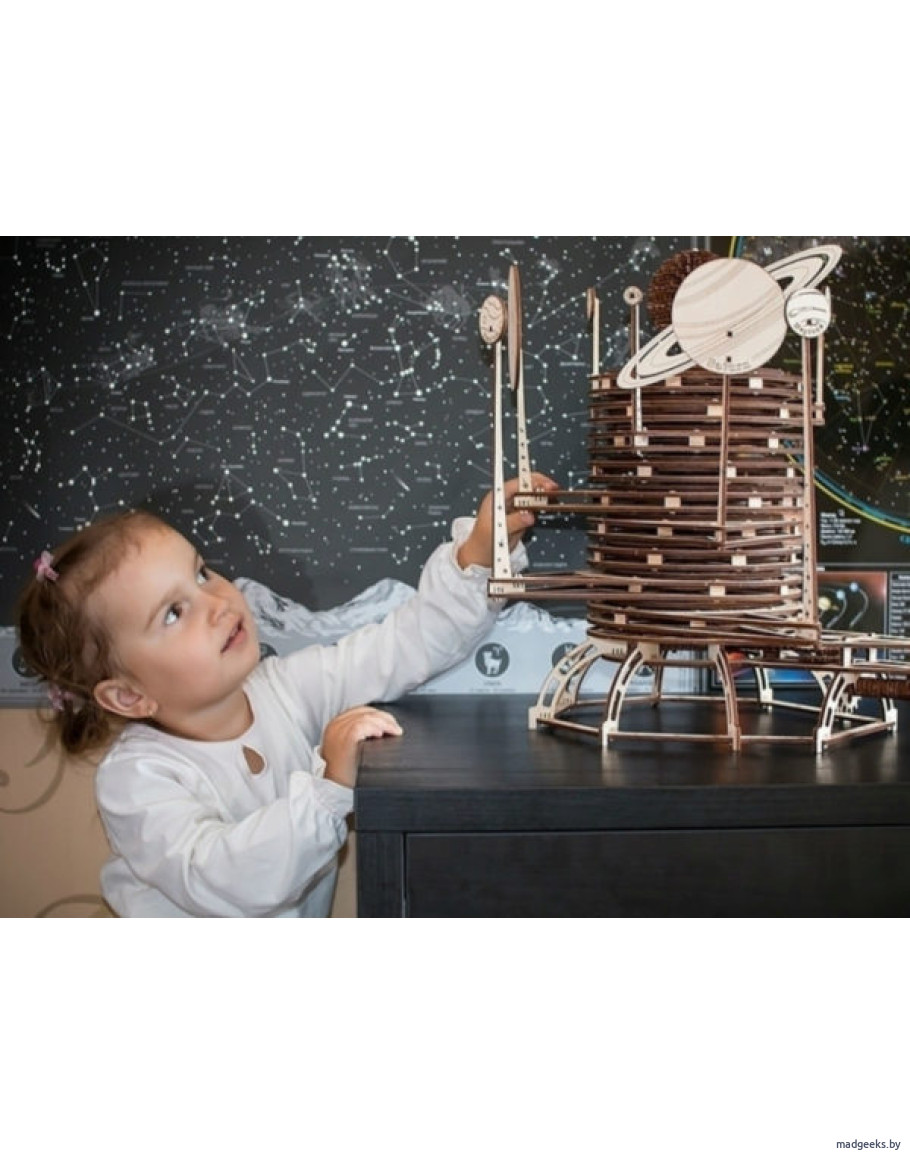 Деревянный 3D-конструктор планетариум от компании Eco Wood Art. Механическая модель солнечной системы будет интересна в сборке как детям, так и взрослым. С её помощью легко рассказывать о строении нашего мира, наглядно показывая ребенку о расположении планет в нашей системе.