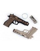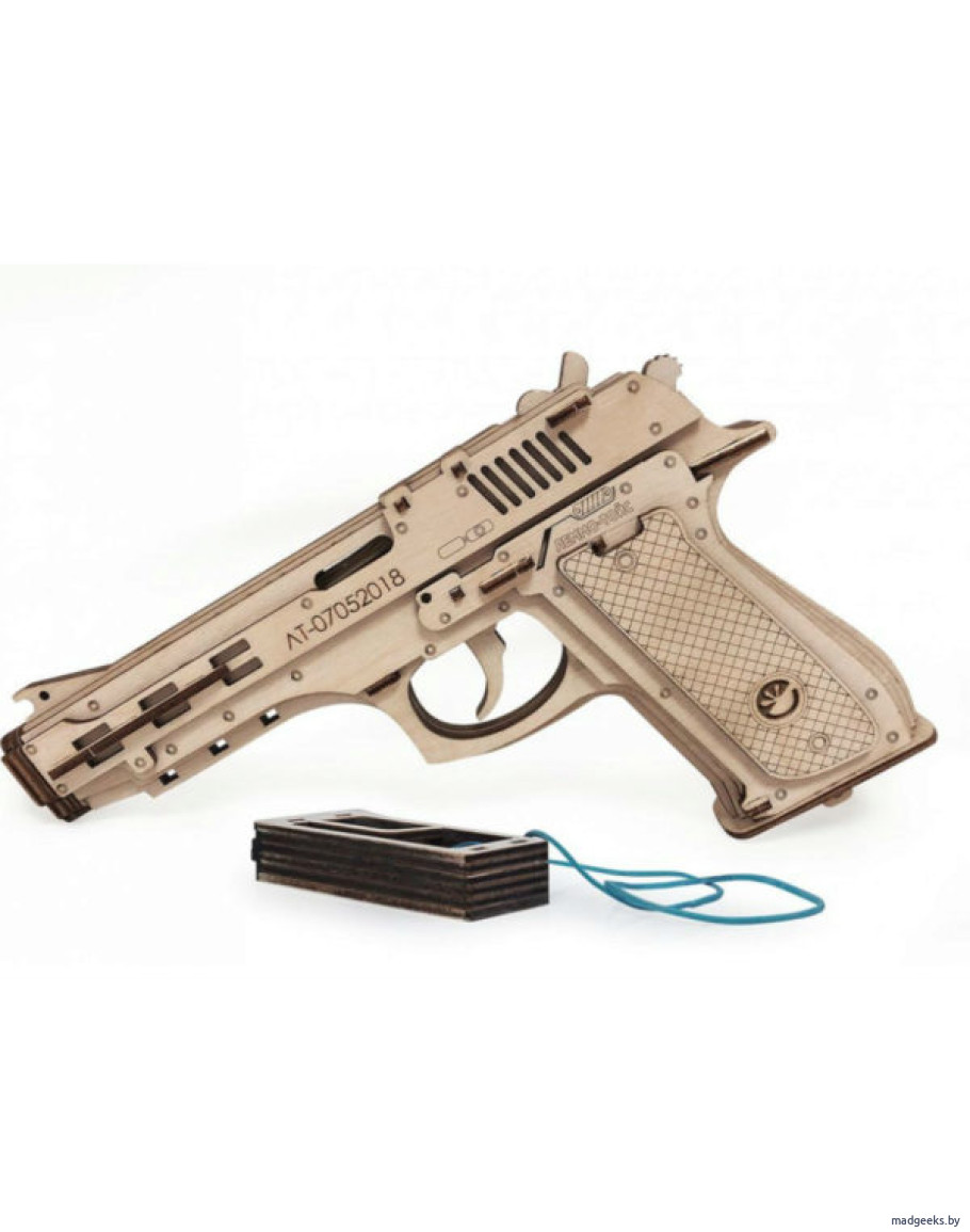 Сборный конструктор представлен в виде пистолета. В комплекте находится 81 деталь, каждая изготовлена из экологически чистой натуральной березовой древесины. Габариты сборной модели пистолета составляют 230 х 35 х 148 мм. Вес 120 грамм.