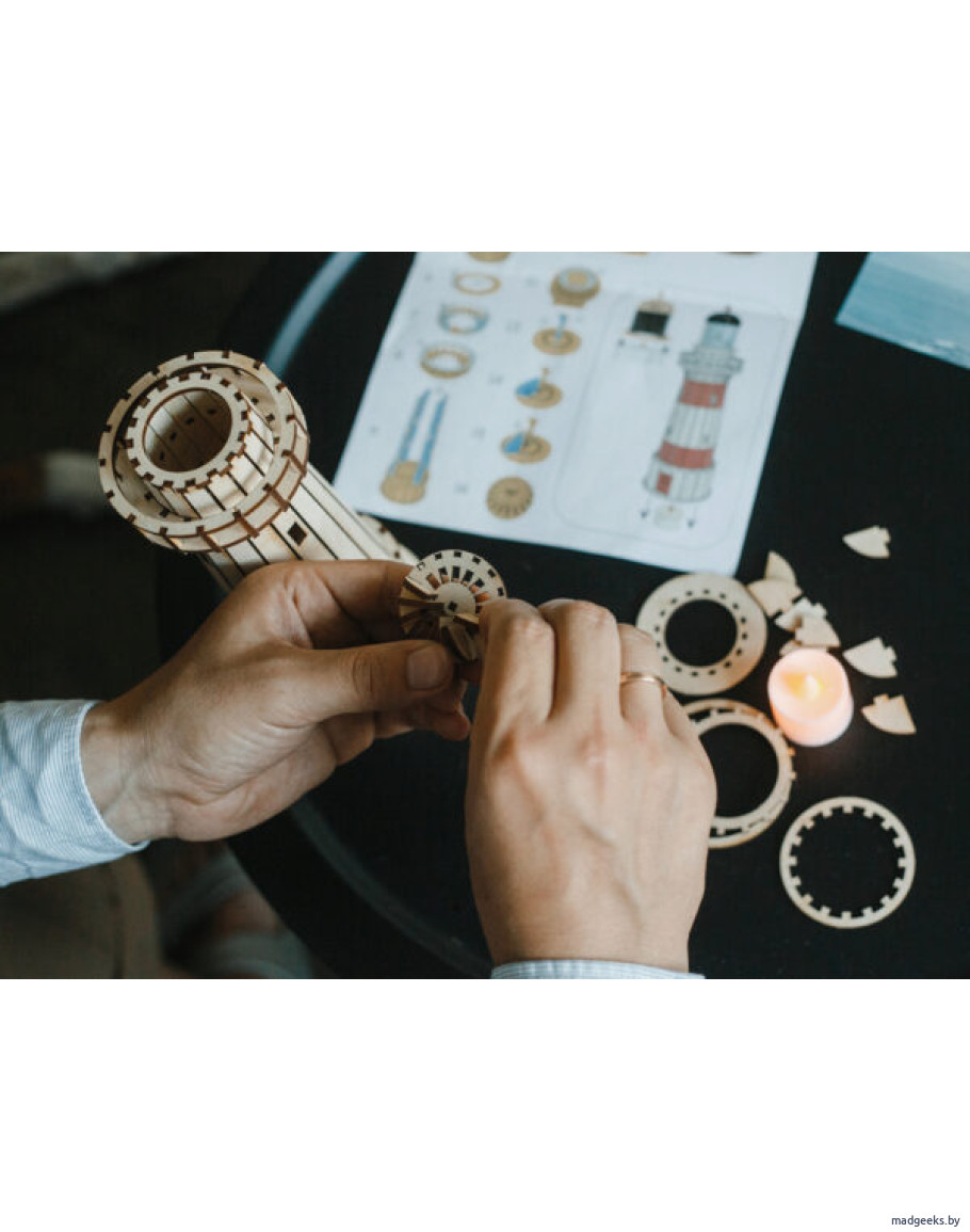 Чтобы собрать маяк, вам потребуется несколько часов времени — все необходимые детали уже находятся внутри комплекта. Начиная с первой детали по инструкции, поочередно собирайте маяка, вытаскивая детали из ячеек деревянных пластин.