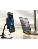 Док-станция Mophie Charge Force Desk Mount выглядит строго и аккуратно. Корпус изготовлен из прочного износостойкого пластика и представляет из себя основание на ножке, с магнитной платформой сверху. Док-станция крепко держится на любой горизонтальной поверхности за счет противоскользящего покрытия на основании. Поворотное крепление магнитной платформы позволяет расположить смартфон вертикально или горизонтально. Это дает возможность расположить смартфон под любым углом, чтобы работать с экраном смартфона.