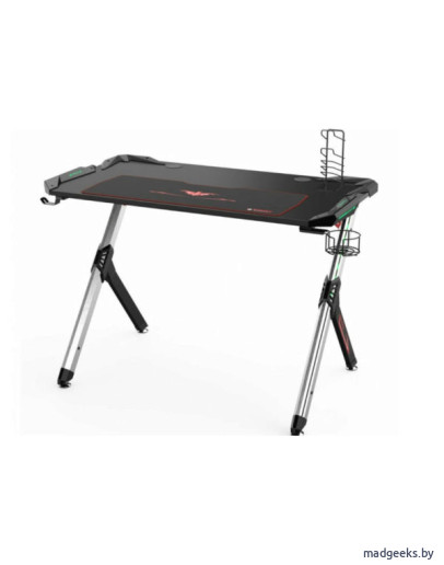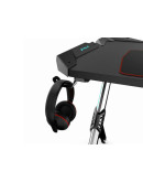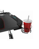 На самом столе находится подставка, предназначенная для геймпада или другого девайса. Под левой рукой расположен крючок для подвешивания гарнитуры. Около переднего правого угла в воздухе закреплена подставка для стакана или чашки. Подставка размещена немного ниже рабочей поверхности, так что вы не столкнете с нее локтем кружку с кофе.