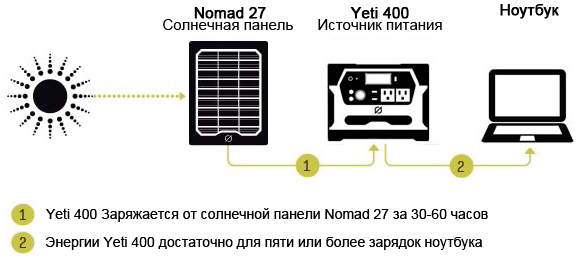 Источник питания Yeti 400 заряжается тремя способами: от сети 220 В за 5 часов; через прикуриватель автомобиля приблизительно за 13 часов; от солнечной панели. Например, время зарядки от панели Nomad 27 составляет 30-60 часов.