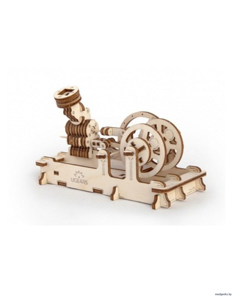 На этот раз UGears предлагают вам собрать работающий пневматический двигатель. Только представьте, из плоских фанерных деталей у вас получатся два герметичных цилиндра. На частоту вращения укажет воздушный тахометр.