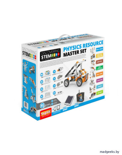 Серия конструкторов DISCOVERING STEM была разработана квалифицированными учеными и педагогами. Подразумевается, что с помощью PHYSICS RESOURCE MASTER SET дети освоят на практике базовые законы физики и механики. Используя набор, ребенок изучит следующие темы: