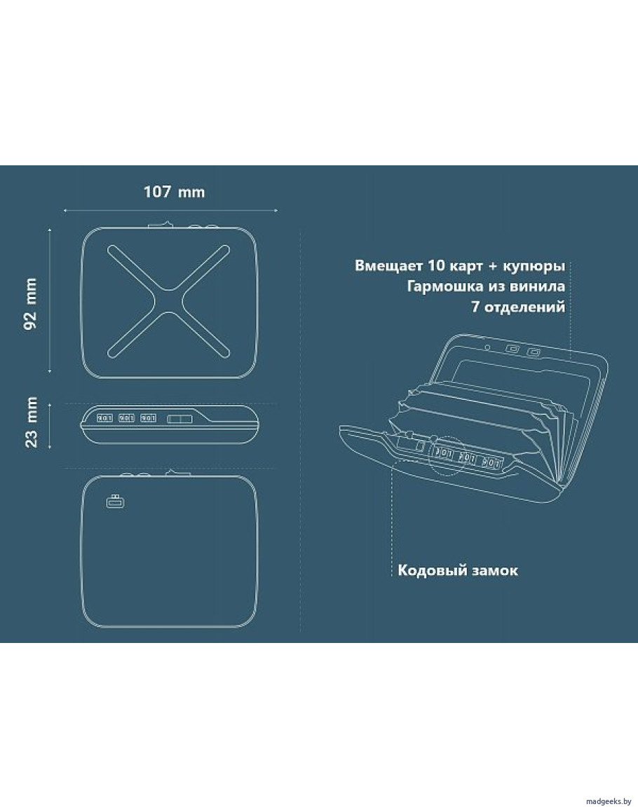 - 7 отделений выполнены в формате виниловой гармошки, которая разворачивается веером при открывании кошелька