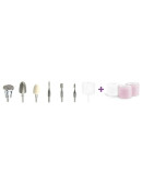 В комплектацию входят семь насадок с разным функционалом: насадка с покрытием из наждачной бумаги, бор в форме «пламени», сапфировый конус, игольчатая сапфировая фреза, войлочный конус, диск с сапфировым напылением, цилиндрический бор.