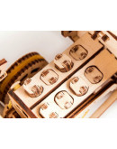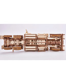 Механический 3D-пазл изготовлен из березовой фанеры, на некоторых элементах лазером нанесены узоры. Это базовый комплект, к которому можно дополнительно приобрести наборы «Автовоз» и «Цистерна». Это одна из самых сложных моделей, которая состоит из почти 500 деталей. Размер собранной модели составляет 37,5 х 11 х 15 сантиметров.