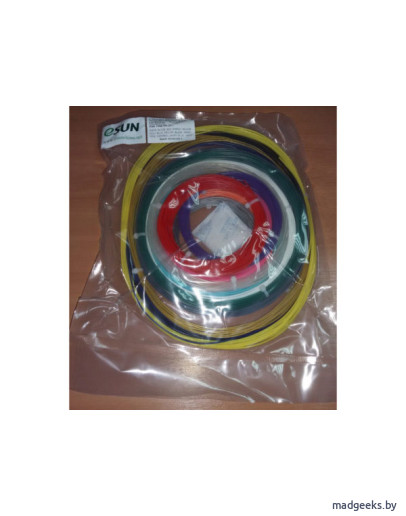 В наборе представлены катушки цветного пластика из 14 цветов. Диаметр нити составляет 1,75 мм. Длина каждого цвета – 9 метров. В наборе представлены цвета: белый, черный, голубой, красный, натурально-белый, пурпурный, розовый, серебряный, синевато-серый, синий, темно-синий, зеленый, желтый, золотой.