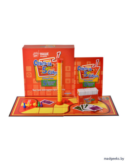 Основная тематика настольной игры – музыка. Есть такие вопросы, как «Назовите три атрибута рок-музыканта», «Назовите трех героев мюзиклов», «Назовите три песни, которые хорошо слушать в пробке» и т.д. Многие вопросы абстрактные и на них проще дать ответ, однако над некоторыми придется подумать. Игра отлично подойдет для компании от 3 до 6 человек. Время игры занимает от 20 до 60 минут. «Ответь за 5 секунд» предназначена для лиц старше 8 лет.