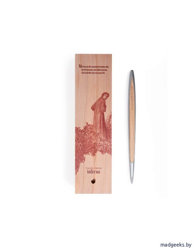 Ручка выполнена из алюминия со вставкой из кедрового дерева. Длина аксессуара составляет 16 сантиметров, а вес ― 39 грамм. Ручка поставляется в коробке из массива кедра, которая также является подставкой для аксессуара. На коробку нанесена иллюстрация, изображающая Ад из знаменитого произведения Данте «Божественная комедия». Иллюстрация написана французским художником XIX века Гюставом Доре.