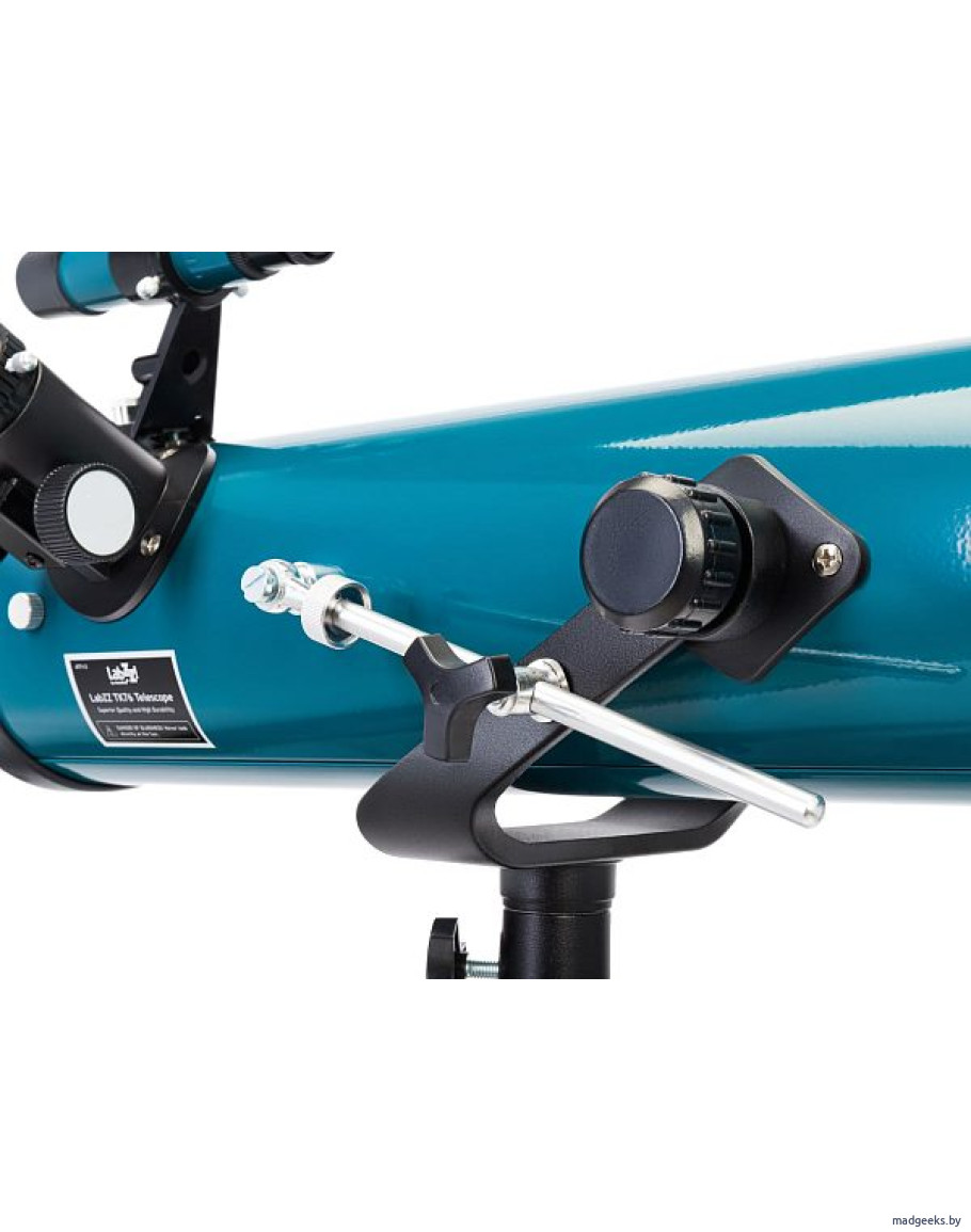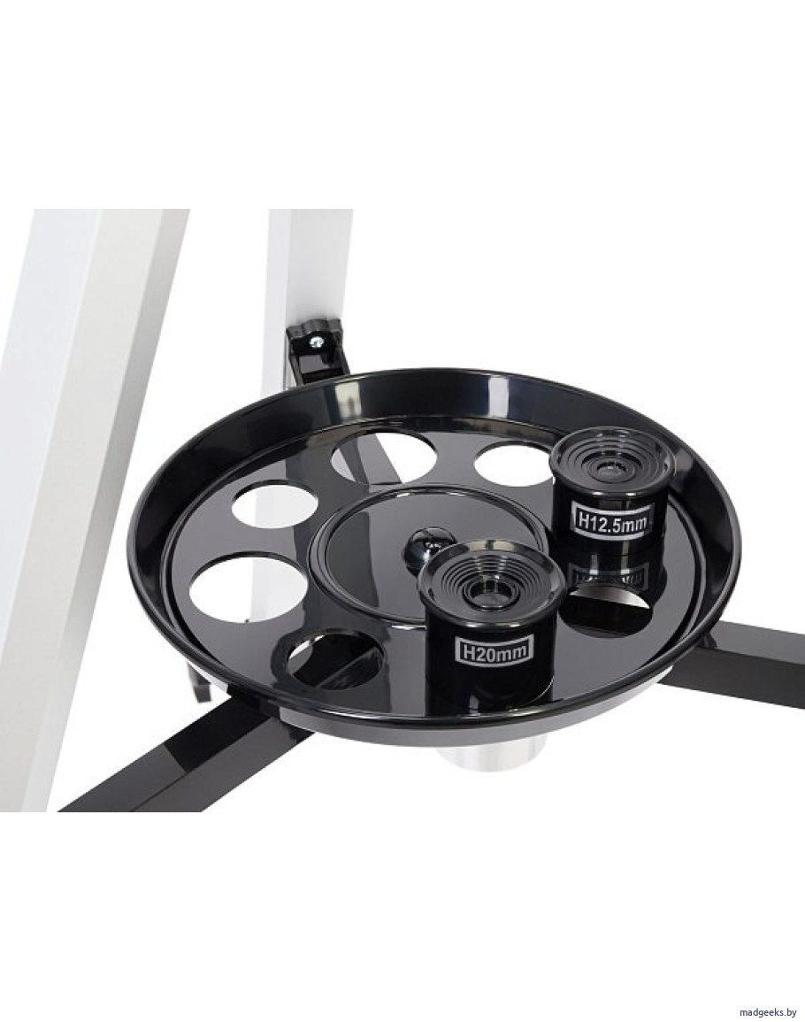 Телескоп собран по схеме ньютоновского рефлектора, все элементы сделаны из стекла и дополнены антибликовым покрытием. Оптика создает четкое изображение, собирает достаточно света для основных астрономических наблюдений, нивелирует аберрации. Азимутальная монтировка имеет микровинт на вертикальной оси, который позволяет добиться максимально плавного и точного наведения на выбранный объект. Алюминиевая тренога устойчивая и надежная. В центре находится полочка для аксессуаров. Высоту ножек треноги можно регулировать.