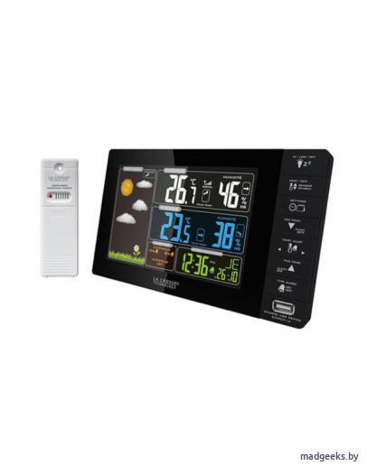 LaCrosse WS6827 — это стильная метеостанция с функцией замера основных значений погоды — температуры и влажности. Гаджет получил обновленный яркий дисплей, на котором еще удобнее стали отображаться все данные с прогнозом погоды и показателями.