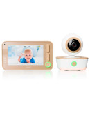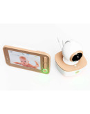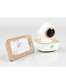 Корпус устройства выполнен в бежево-золотистом цвете с белоснежными элементами. Блок с экраном оснащен дисплеем диагональю 10,9 см. На панели устройства также расположены кнопки быстрого доступа к часто используемым функциям. Детский блок оснащен поворотной камерой.